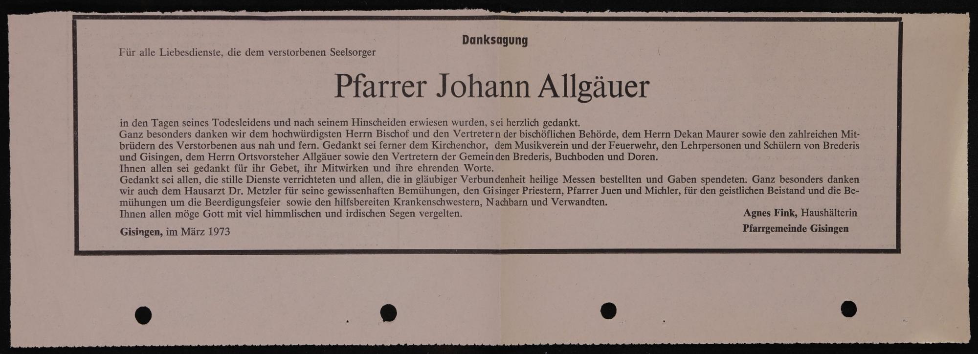 Johann Allgäuer - Danksagung